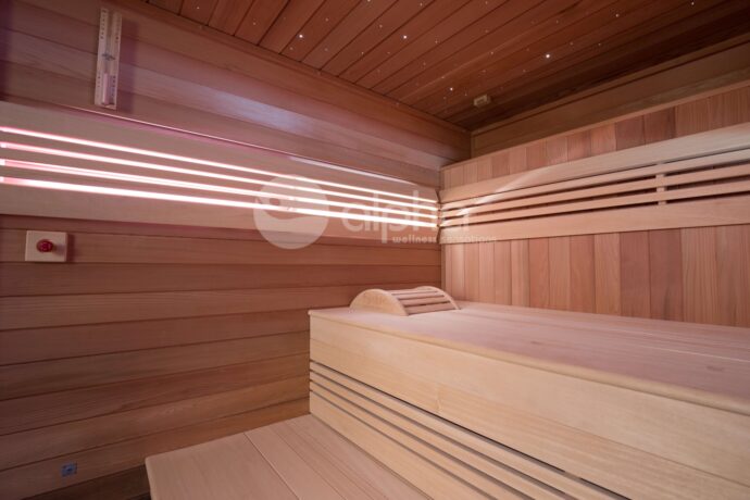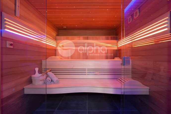 De verdoken ledverlichting kan je nagenoeg in elke kleur laten oplichten tot de gewenste sfeer. Voor het interieur is er keuze uit ceder, espen of hemlock. De buitenzijde bestaat uit mdf, met een keuze uit 9 verschillende kleuren en een afbeelding naar keuze voor op de zijpanelen. Bij de Intens-S bevindt de krachtige oven zich achter de banken.